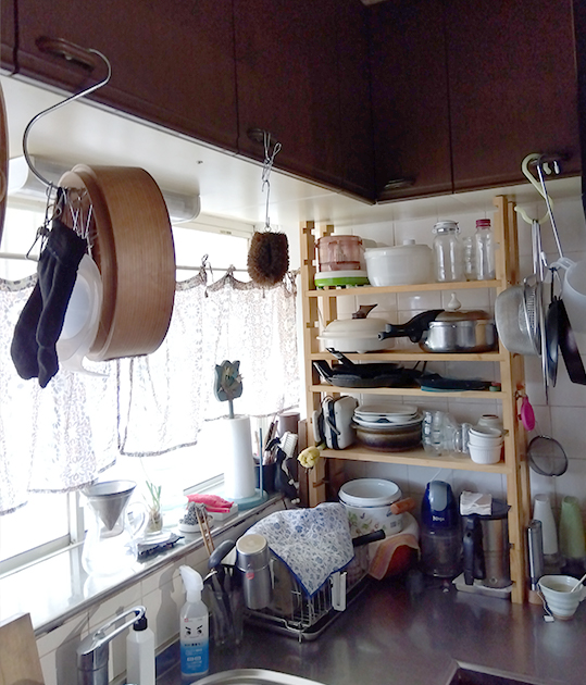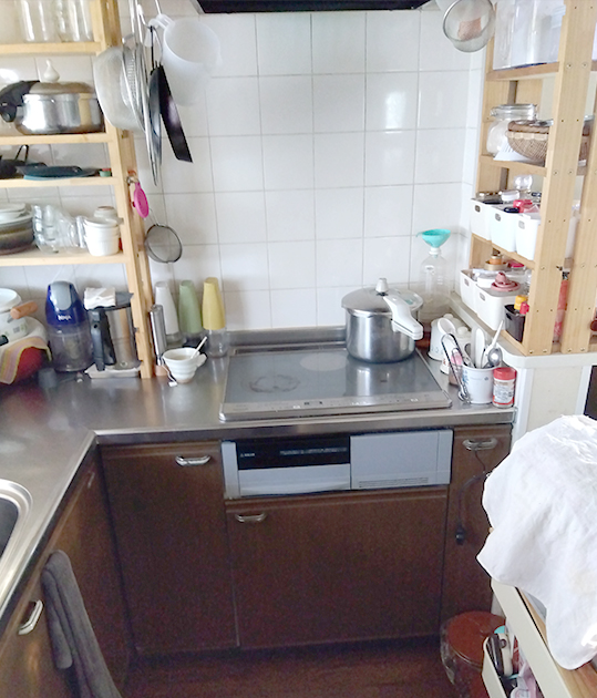 収納は手作りの木製棚を活用し、カウンター代わりに台を置くなど工夫されていましたが、調理スペースが限られ、動線も少し複雑でした。