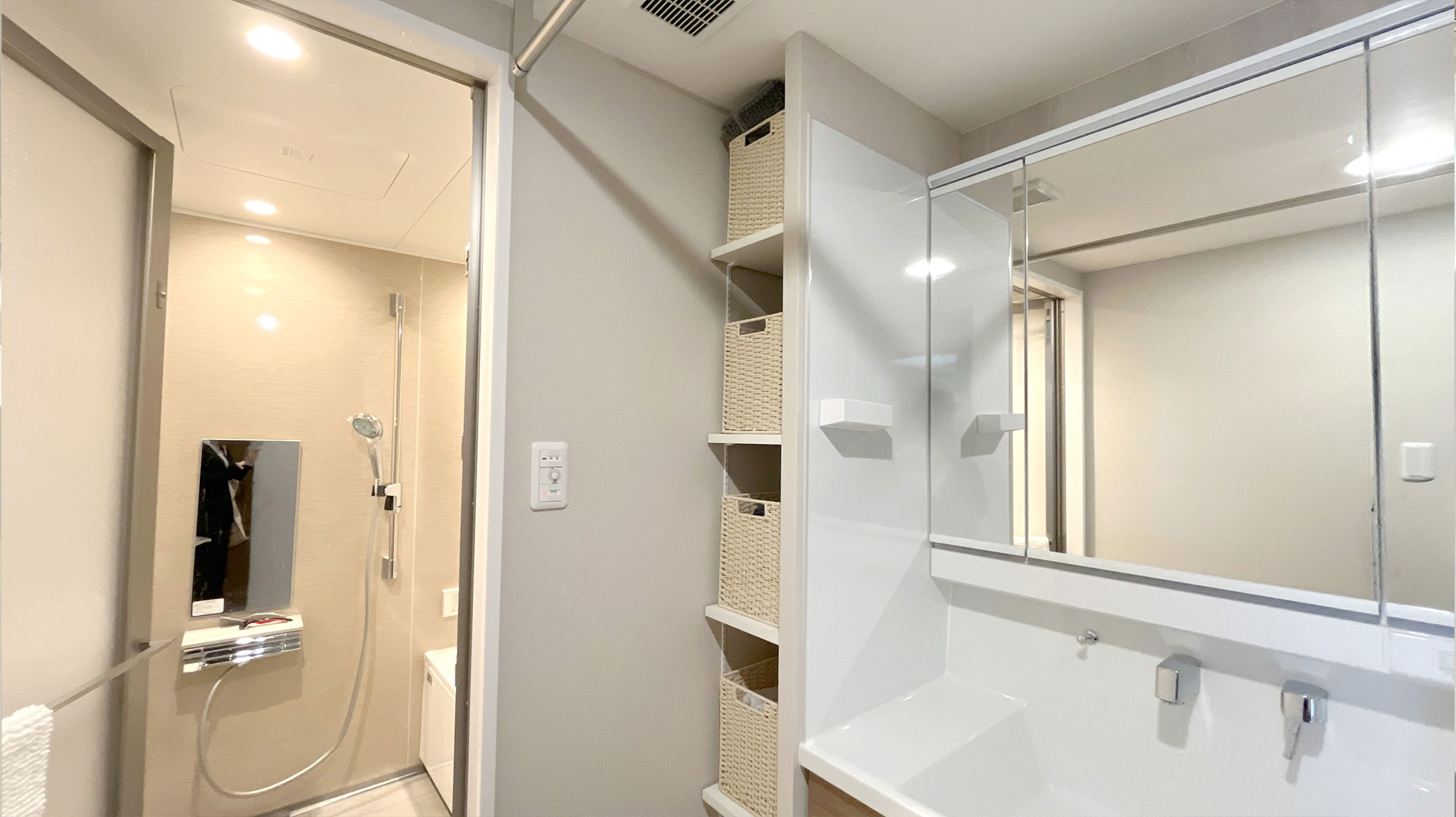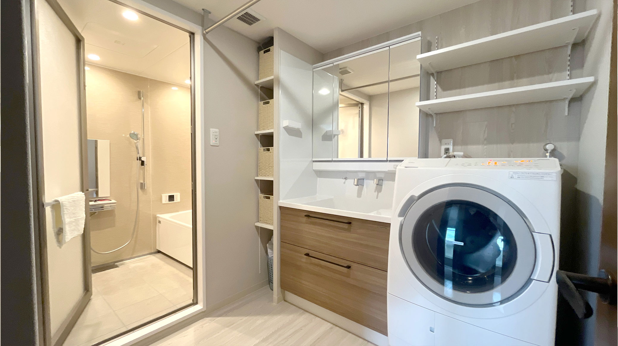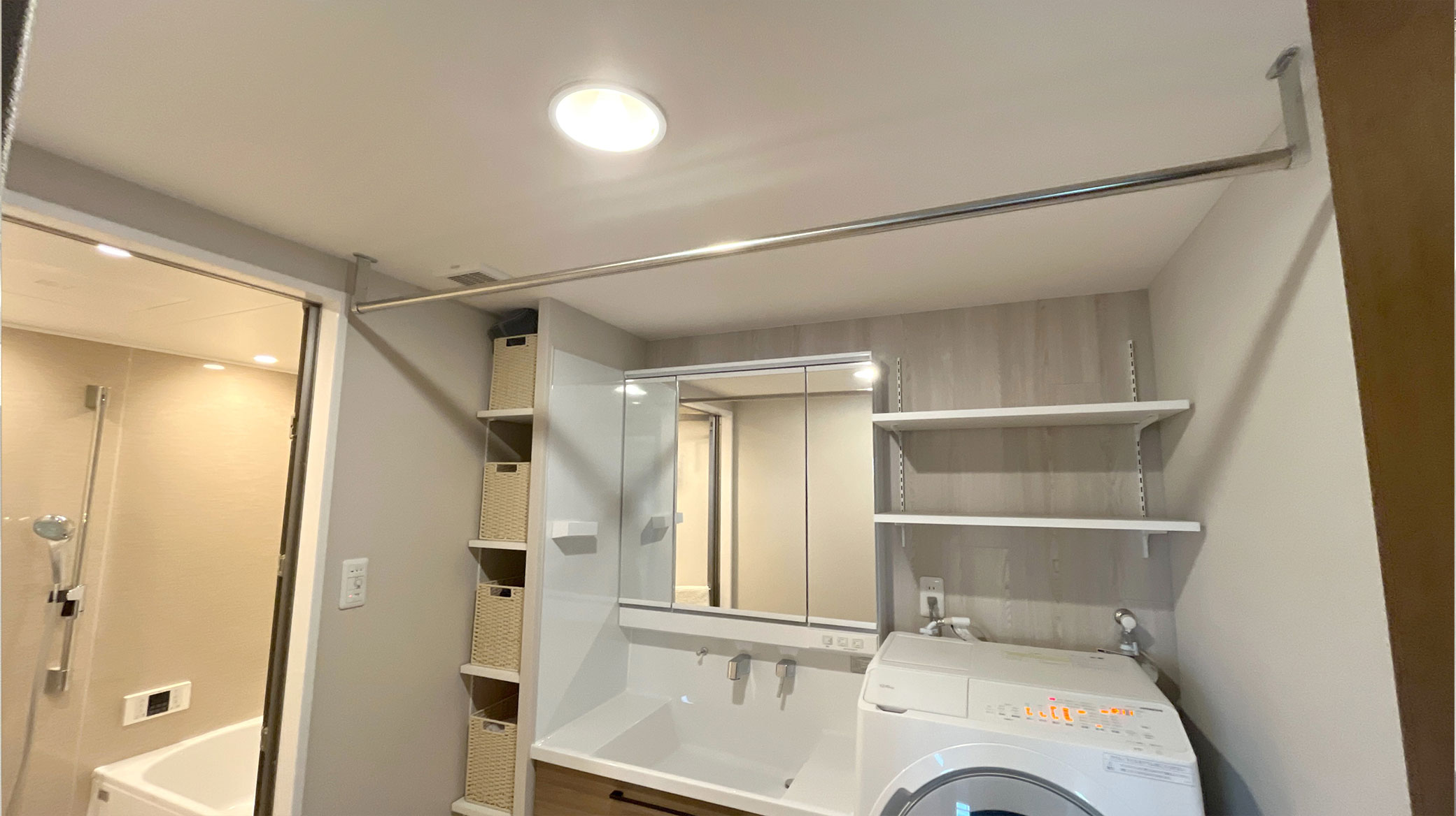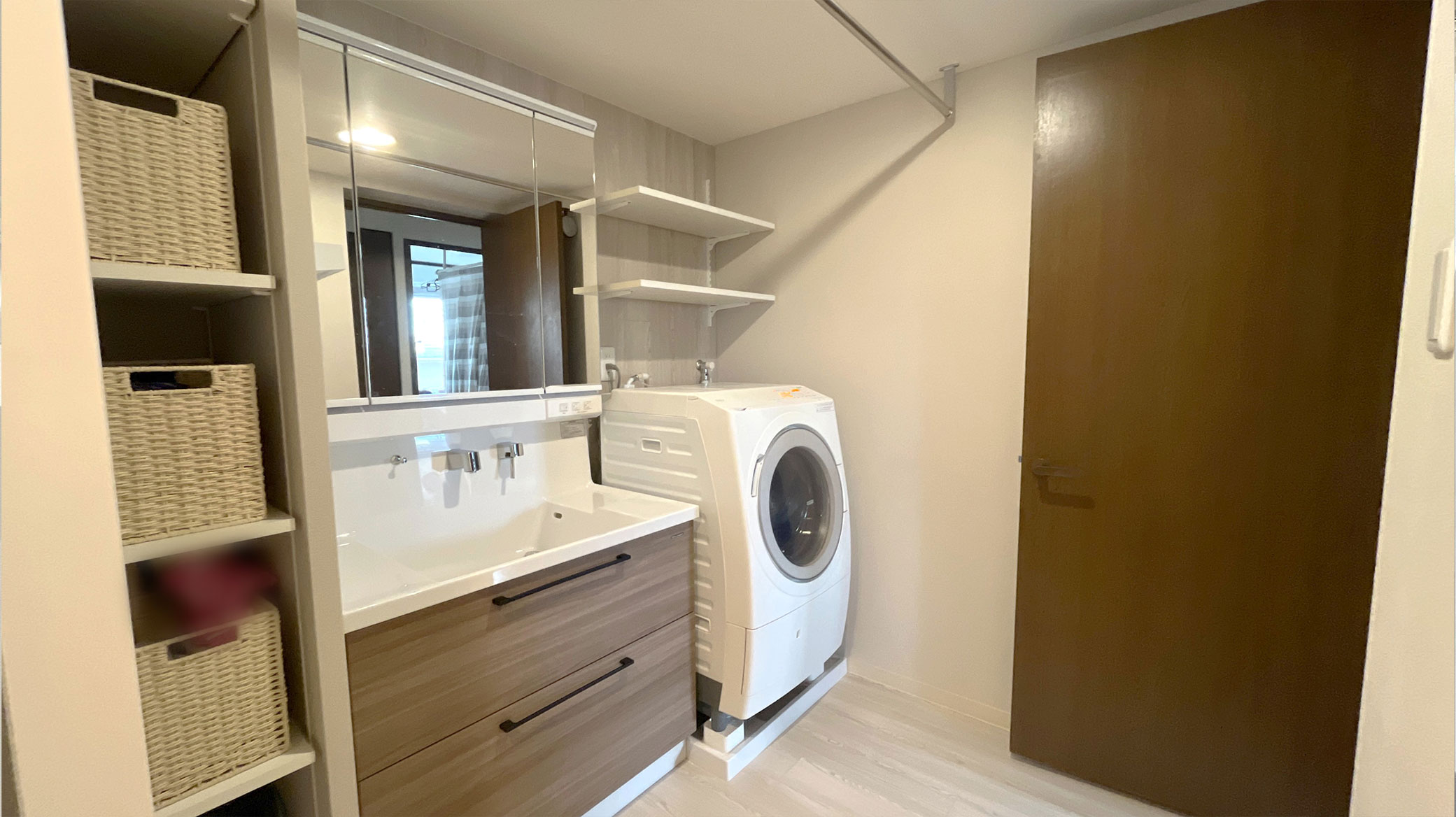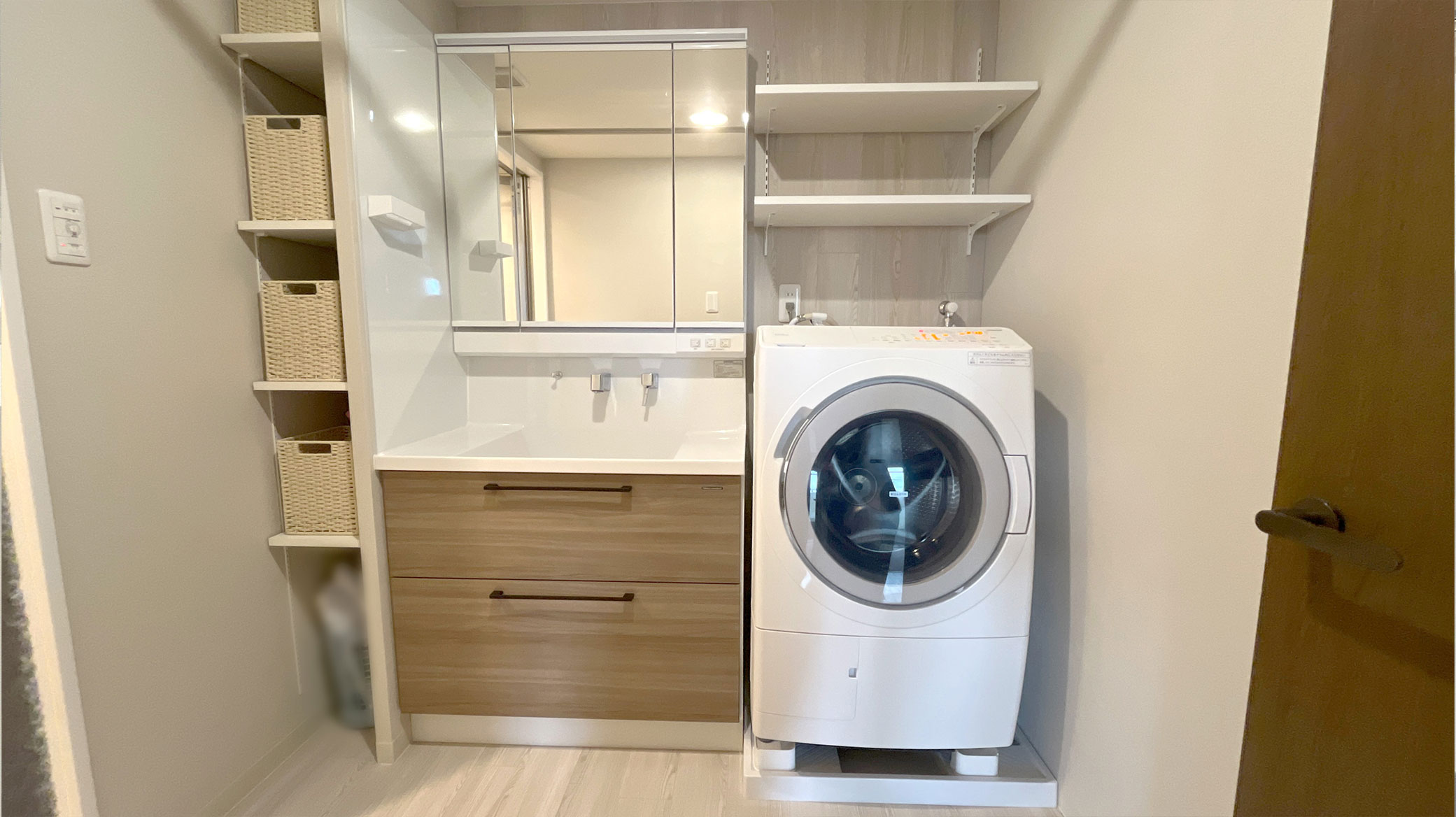 洗面台・洗濯機周辺に高さ調整が可能な棚を設置し、すっきりかつ収納量がぐっと増えています。
