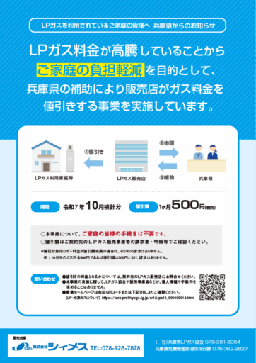 つきましては、兵庫県にお住いのお客さまへ、令和7年10月のガス料金を対象に値引きを実施させていただきます。
