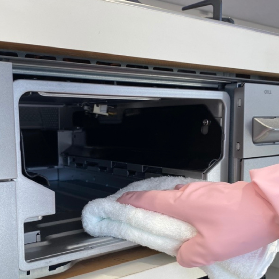 グリル庫内も軽い汚れなら、パネル同様、台所用中性洗剤をつけた柔らかい布巾でふき取ります。