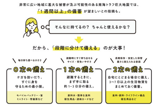 非常時の備えは、0次、1次、2次、と分けて考えることがおすすめです。