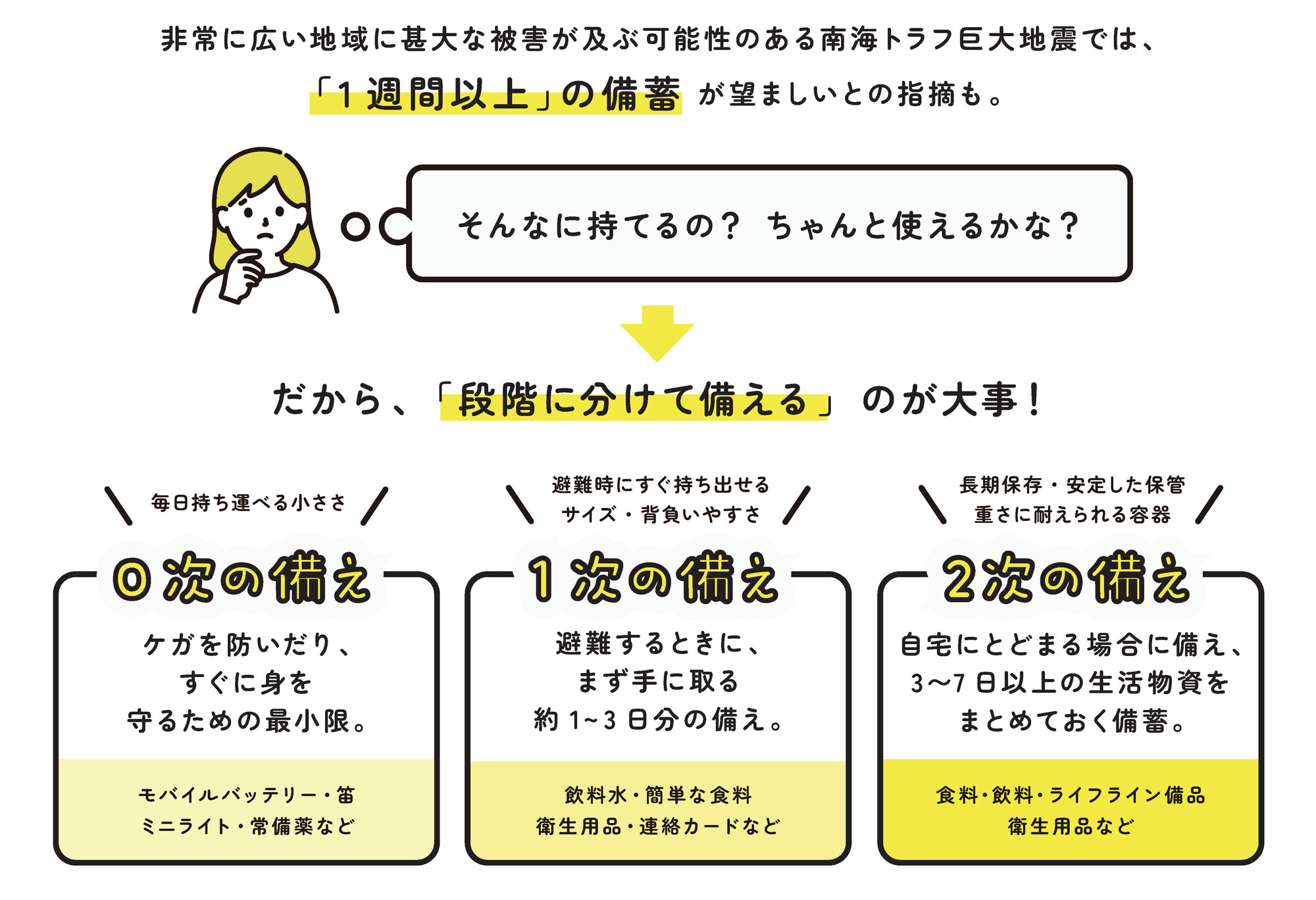 非常時の備えは、0次、1次、2次、と分けて考えることがおすすめです。