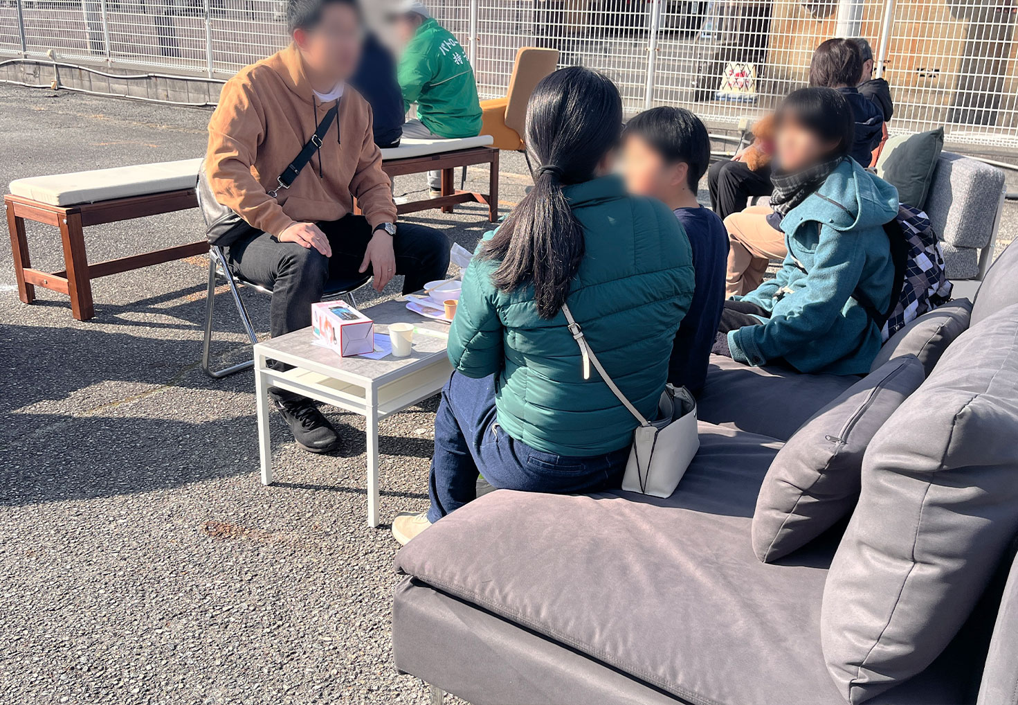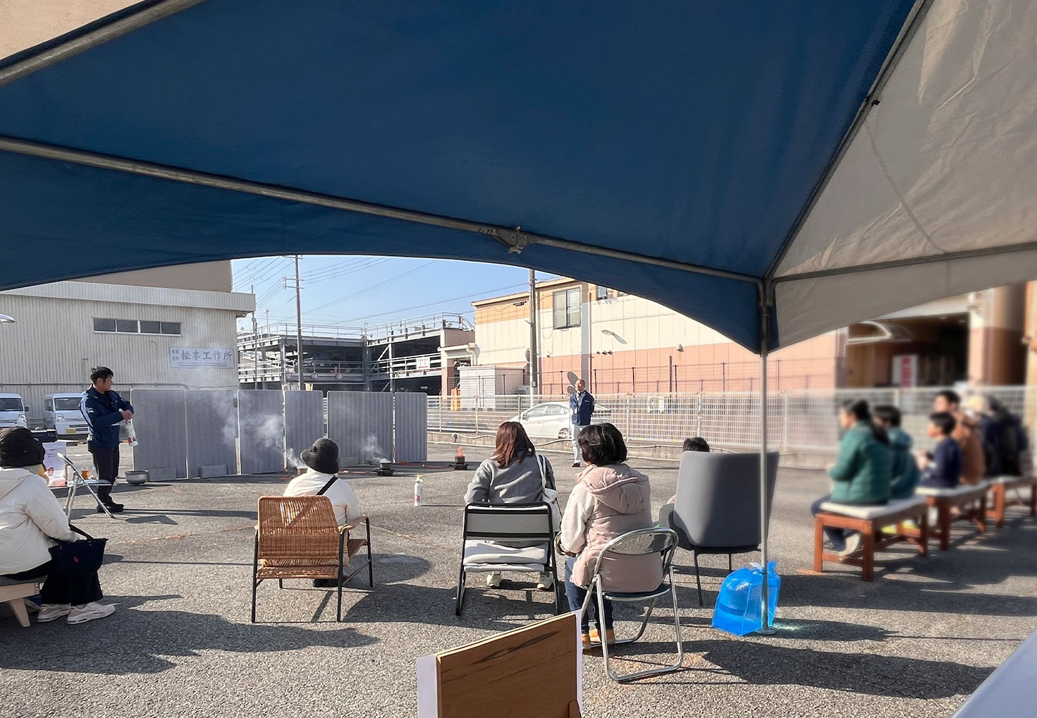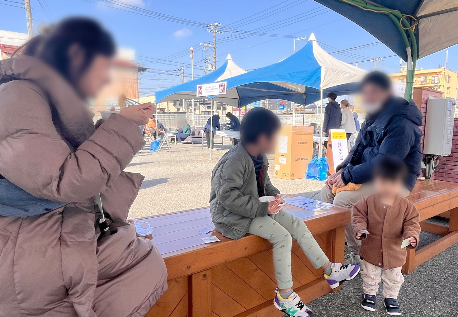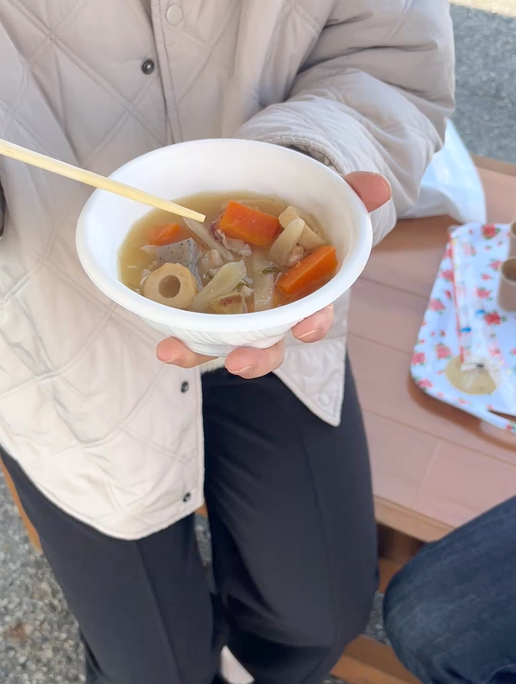 ▼ LPガス発電機で稼働させている床暖ベンチで、あたたかい豚汁をいただきます!